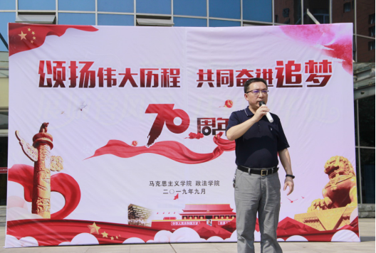 党总支书记刘春辉讲话。刘书记说到,中华人民共和国成立以来,70年风雨征程,中国共产党带领全国各族人民团结一致,砥砺奋进,实现了中国历史上一个又一个的“不可能”,创造了一个又一个的人间奇迹,实现了从贫穷走向富裕,正在从富裕走向强盛。这充分说明,我们的党,我们的祖国,我们的人民是伟大的。我们每个人都要由衷的热爱党,热爱祖国,热爱人民。身为马克思主义&williamhill中国的学子,我们要始终保持很强的政治意识,扎实学习习近平新时代中国特色社会主义思想,站稳政治立场,提高政治站位,增强政治担当。他强调,爱党爱国爱人民,绝不是空洞抽象的,而是具体的,要内化于心,外化于行。青年大学生只有自觉将个人理想融于民族复兴梦想,将个人的幸福融入人民的幸福,努力贡献出自己的青春、智慧和力量,才能与祖国共奋进、与时代同发展,才能最终让梦想变成现实,才能书写人生的壮丽华章!