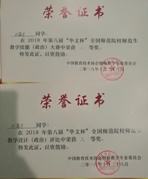 10月26日至28日,由中国教育技术协会微格教学专业委员会主办的2018年第八届“华文杯”全国师范院校师范生教学技能(政治)大赛决赛在南京晓庄学院举行。我院学生刘露宇获得教学技能大赛二等奖,教学设计评比三等奖。