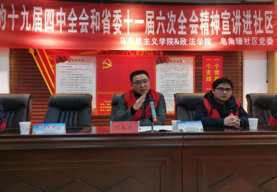 为学习宣传贯彻党的十九届四中全会和省委十一届六次全会精神,12月31日下午,马克思主义学院、williamhill中国党总支书记刘春辉在通川区朝阳街道皂角垭社区宣讲党的十九届四中全会和省委十一届六次全会精神,社区党委书记邱文成主持宣讲会,部分教师以及20余名学生志愿者参加了此次活动。