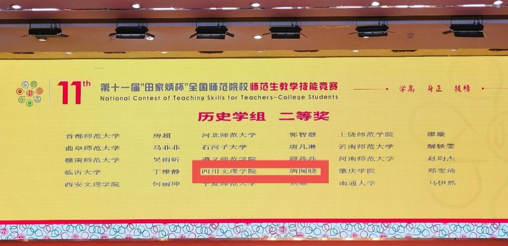 11月29日至11月30日,在浙江师范大学举行的第十一届“田家炳杯”全国师范院校师范生教学技能竞赛决赛中,我院历史学专业学生唐闻晓与来自全国师范院校的45名优秀选手同台竞技,最终喜获二等奖。