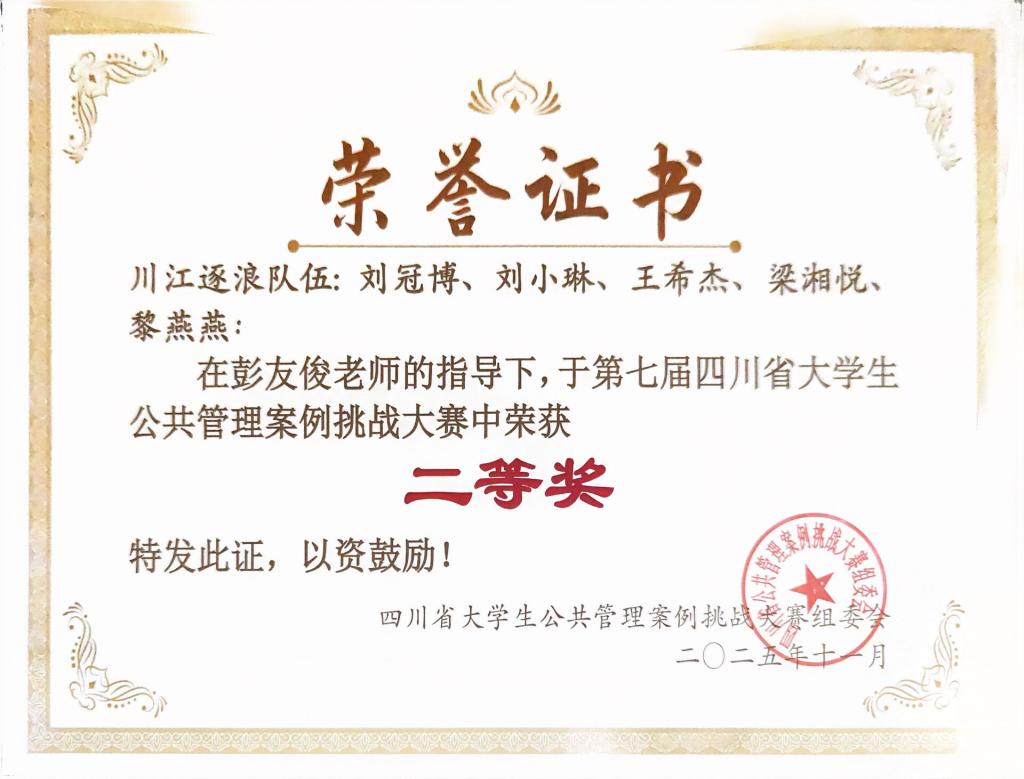 本届大赛吸引了来自厦门大学、四川大学、南开大学等43所高校共166支队伍踊跃报名参赛。各参赛队伍历经初赛、复赛、决赛多个环节的层层比拼与严格筛选,最终决出优胜者。我院行政管理专业本科生刘冠博、黎燕燕、刘小琳、王希杰和知识产权专业本科生梁湘悦共同组建的“川江逐浪”团队,凭借作品《“积分换未来”:如何以数字杠杆激活乡村智治新生态?——以四川省安岳县交通村为例》荣获二等奖。