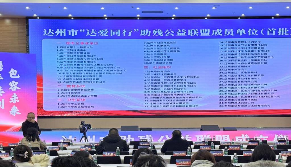 12月11日下午,“向阳而生・达爱同行”达州市助残公益联盟成立大会在达州市融媒体中心举行。联盟的成立旨在整合社会资源,搭建协同平台,为残疾人提供更系统、更专业的支持服务,推动本地助残事业新发展。大会汇聚了国有企事业单位、教育系统、卫生系统和社会组织等多方力量。我院是联盟首批成员单位之一,邓璐老师和近30名学生受邀参加成立大会。