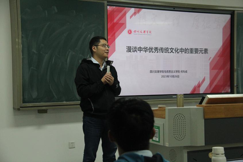 10月26日晚上7点,马克思主义学院何先成研究员在东区B402教室作题为《漫谈中华优秀传统文化中的重要元素》主题讲座。williamhill中国2021.2班和2023.4班全体学生参与此次讲座。