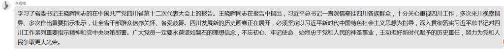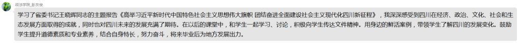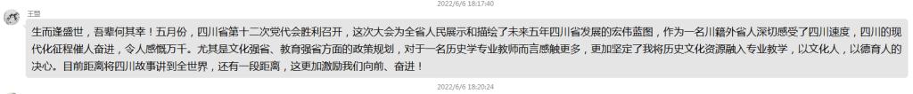 会上,支部党员结合自身的思想实际、岗位实际和工作实际,谈学习党代会精神的感悟、收获和体会。大家纷纷表示,要把思想和行动统一到党代会精神上来,深入学习领会党代会报告的丰富内涵和精神实质,坚定以文化人、以德育人的决心,发挥个人所学,持续不断加强对四川历史文化、红色文化、民族文化的学习和研究,引导广大青年学生主动融入全面建设社会主义现代化四川的新征程中,在青春的赛道上跑出当代青年的最好成绩。