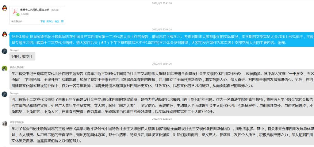 6月6日,政治历史党支部召开线上支部党员大会,专题学习中国共产党四川省第十二次代表大会精神。本次会议由支部书记何先成主持,williamhill中国、知识产权学院党总支副书记、院长刘长江以普通党员身份参加并与支部党员讨论交流。
