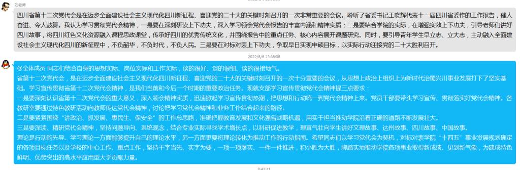 省第十二次党代会,是在迈步全面建设社会主义现代化四川新征程、喜迎党的二十大的关键时刻召开的一次十分重要的会议,从思想上政治上组织上为新时代治蜀兴川事业发展打下了坚实基础。学习宣传贯彻省第十二次党代会精神,是我们当前和今后一个时期的重要政治任务。何先成就支部学习宣传贯彻党代会精神提出三点要求:一是要深刻认识省第十二次党代会的重大意义,深入领会精神实质,迅速掀起学习宣传贯彻热潮,把思想和行动统一到党代会精神上来。党员干部要带头学习宣传、贯彻落实好党代会精神;各教研室要通过特色教研活动向教师传达党代会精神,讨论把学习党代会精神和业务工作结合起来的路径。二是要紧紧围绕“讲政治、抓发展、惠民生、保安全”的工作总思路,准确把握教育发展和文化强省战略机遇,用实干担当推动学院沿着正确的道路不断发展壮大。三是要深读、精研党代会精神,坚持问题导向、系统观念,结合专业实际寻找学术增长点,以科研促进教学,理直气壮向学生讲好文理故事、达州故事、四川故事、中国故事。他希望大家以学习党代会精神为契机,对标对表学院“十四五”事业发展规划确定的各项目标任务以及学校的中心工作、重点工作,坚持干字当先、实字为要,一项一项落实、一件一件推进,积小胜为大胜,脚踏实地推动学院各项事业取得新成绩、见到新气象,为建成特色鲜明、优势突出的高水平应用型大学贡献力量。