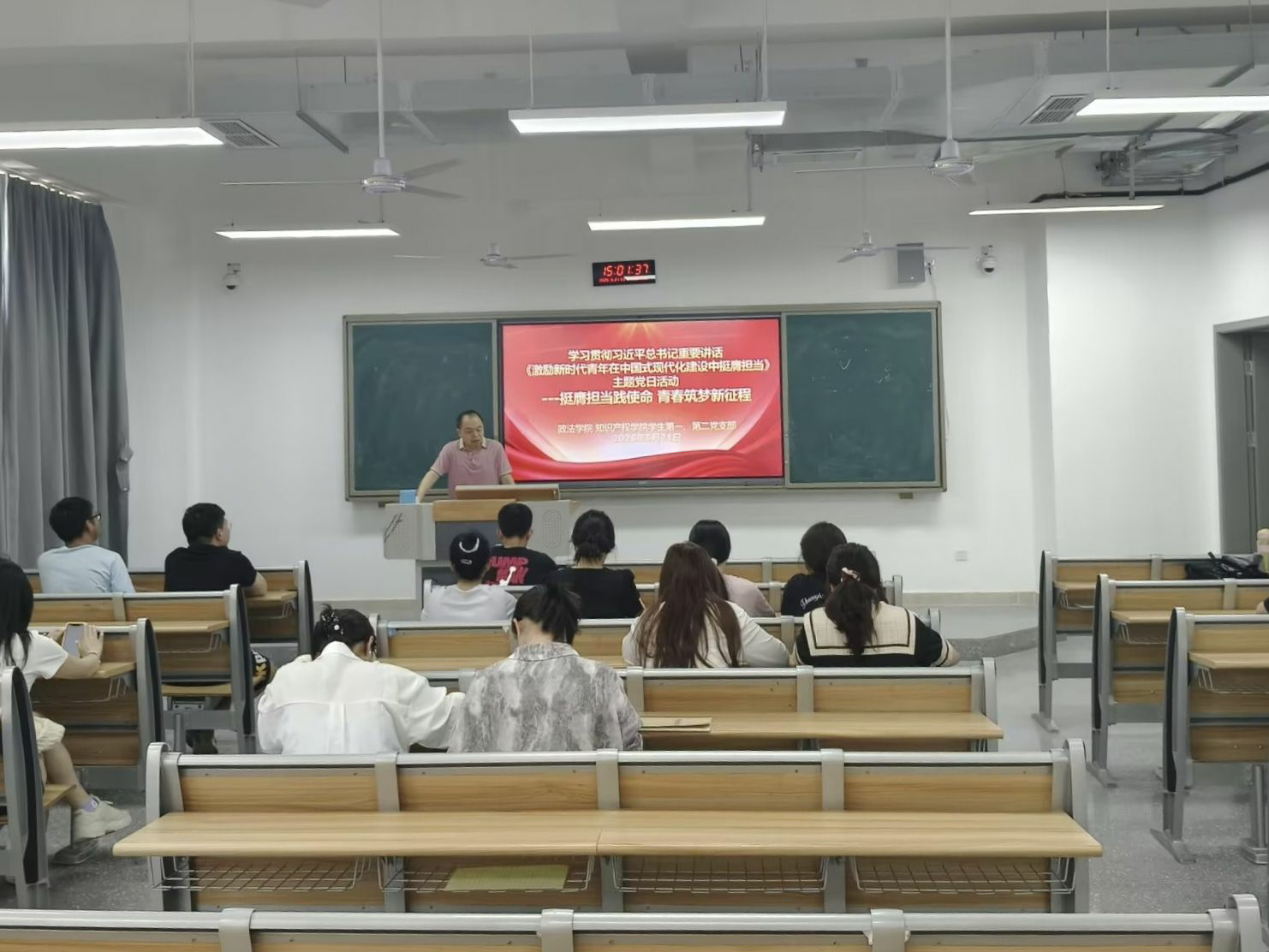 为深入学习贯彻习近平总书记《激励新时代青年在中国式现代化建设中挺膺担当》重要讲话精神,引导学生党员深刻理解新时代青年在中国式现代化建设中的责任与使命,近日,williamhill中国、知识产权学院学生第一党支部、学生第二党支部在莲湖东区B310教室开展“挺膺担当践使命,青春筑梦新征程”主题党日活动,学生第一党支部书记唐幸福主持。