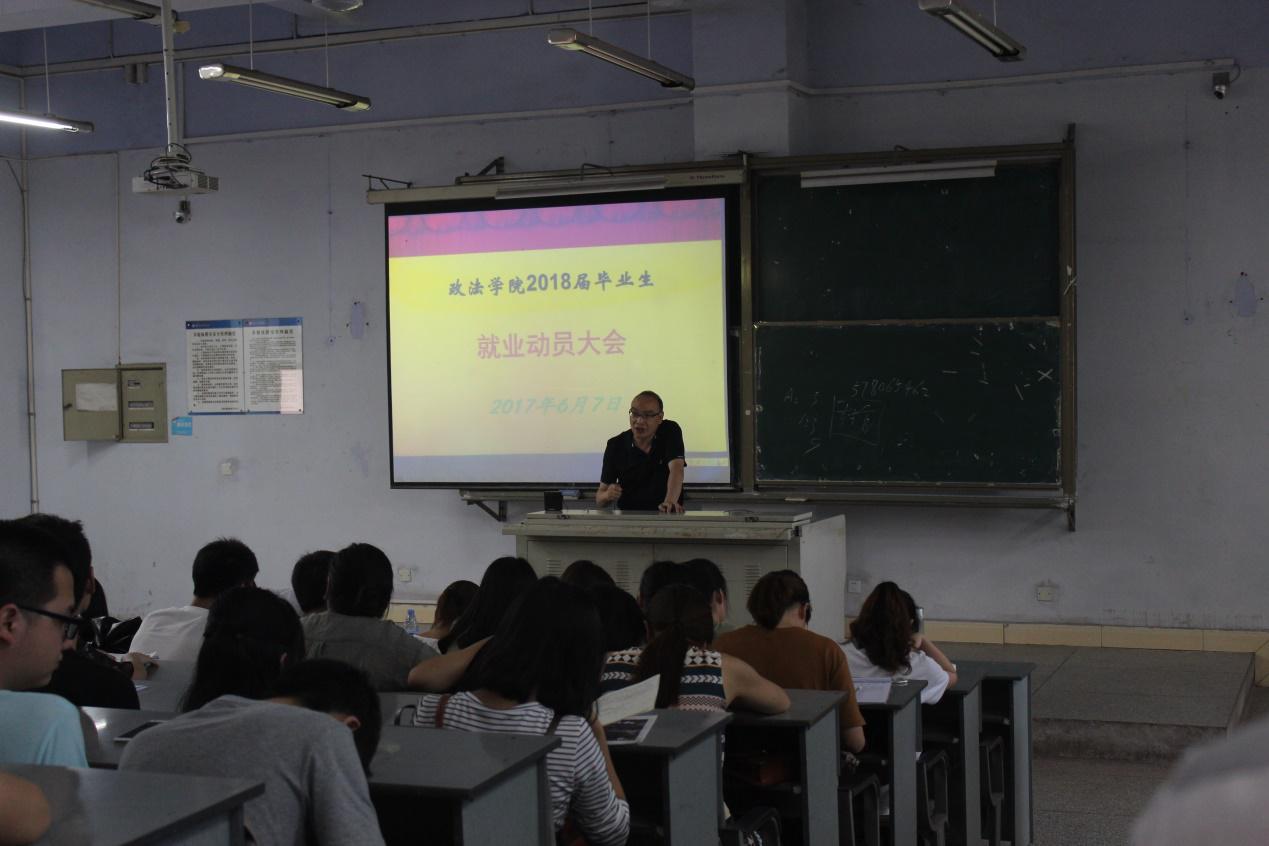 在就业动员阶段,张俊峰老师首先作就业动员,他介绍了学院2017届毕业生就业情况和学院就业工作要求。接下来,张善喜老师强调了大学生就业的严峻形势,希望同学们有压力与紧迫感,他向2018届学生提出三点建议:明确择业目标;围绕择业目标努力“备战”,笔试和面试前做好充分准备;形成积极、自信、开放、淡然的择业心态。最后,陈书记针对就业问题提出了三点建议,希望同学们拥有既不好高骛远,也不妄自菲薄的良好心态,依据专业、知识结构、自身能力来选择就业方向,他着重强调了就业安全问题,给同学们敲响了警钟。