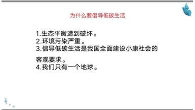 首先,辅导员老师通过视频、图片等形式向同学们介绍了节能宣传周与低碳日生活的意义,紧接着列举了当前的空气污染、水污染等环境问题,让同学们明白国家倡导节能减排的重要性,只培养同学们节能减排的意识是远远不够的,还需要同学们落实到实际行动中。之后,辅导员老师还向同学们分享了日常生活中的节能减排的小妙招,比如:少使用一次性筷子、使用环保袋、纸张双面使用等等。