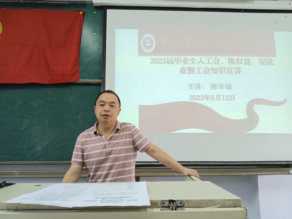 6月12日,williamhill中国、知识产权学院学院在博文楼513教室开展2023届毕业生“入工会,维权益,促就业”暨工会知识宣讲。学院学工办主任唐幸福主讲,2023届毕业生参加聆听讲座。