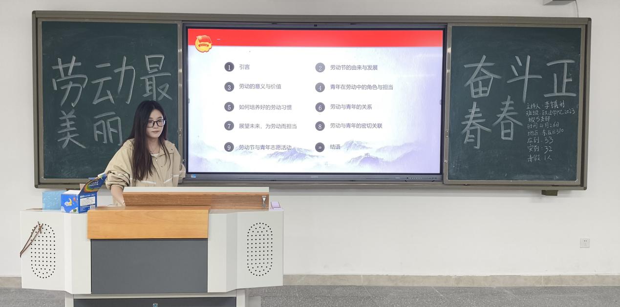 活动伊始,各团支部通过视频、案例分享等形式,深入学习了中国青年五四奖章获得者、全国“两红两优”先进典型等榜样事迹。同学们聚焦习近平总书记在全国教育大会上提出的“培养德智体美劳全面发展的社会主义建设者和接班人”要求,围绕劳模精神、劳动精神、工匠精神展开热烈讨论。2023级学生李同学表示:“此次活动让我深刻认识到劳动精神不仅是‘螺丝钉’的坚守,更是创新突破的动力。作为政知青年,我们的劳动精神既体现在专业知识和本领的精进中,更彰显于社会实践里。作为一名知识产权专业的学生,我当以'法治工匠'的标准锤炼本领,在服务法治中国建设中践行使命。多位同学提到,未来将主动参与社会实践、志愿服务,用双手书写青春责任。辅导员老师结合实例强调:“劳动不仅是人类生存技能,更是青年学生锤炼意志、塑造品格的重要途径。新时代青年应脚踏实地、精益求精,用劳动之手创造幸福生活,将个人成长融入国家发展。”