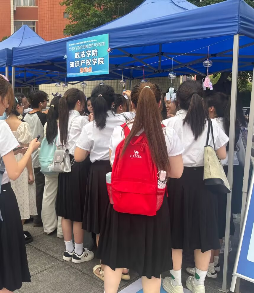 在“法苑心语:烦恼风铃与正义花园”互动体验区,参与的同学将学习压力、人际困惑等烦恼写在特制纸笺上,系于随风轻吟的风铃架。清脆铃声中,匿名纸条上的文字在光影流转间形成独特的“情绪光谱”,而更多学生选择以手写祝福为他人点亮希望之光。这种“情绪漂流瓶”的创意设计,让善意在纸条传递中形成温暖闭环。