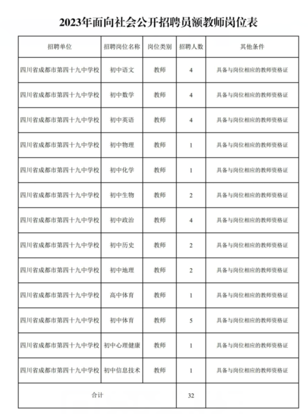 本次公开招聘为编制外招聘,招聘的人员全部实行合同制管理。本次共招聘 32 名员额教师,具体招聘岗位见《四川省成都市第四十九中学校2023年面向社会公开招聘员额教师岗位表》(附件 1,以下简称《岗位表》)。